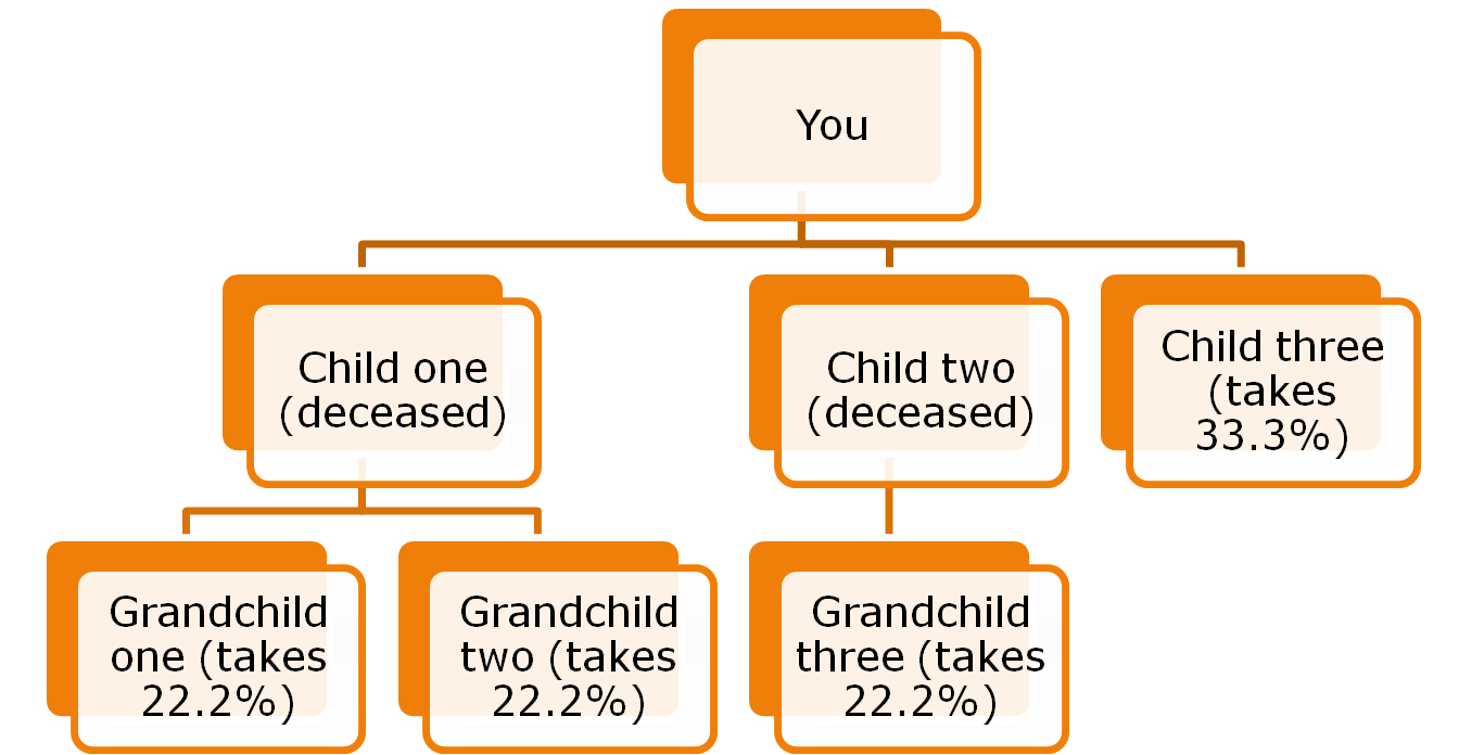 The strict (English version) of per stirpes. This system treats each line of descendents equally. Property is divided equally at the first generation. If one member of the first generation is deceased, his children take his share by representation.